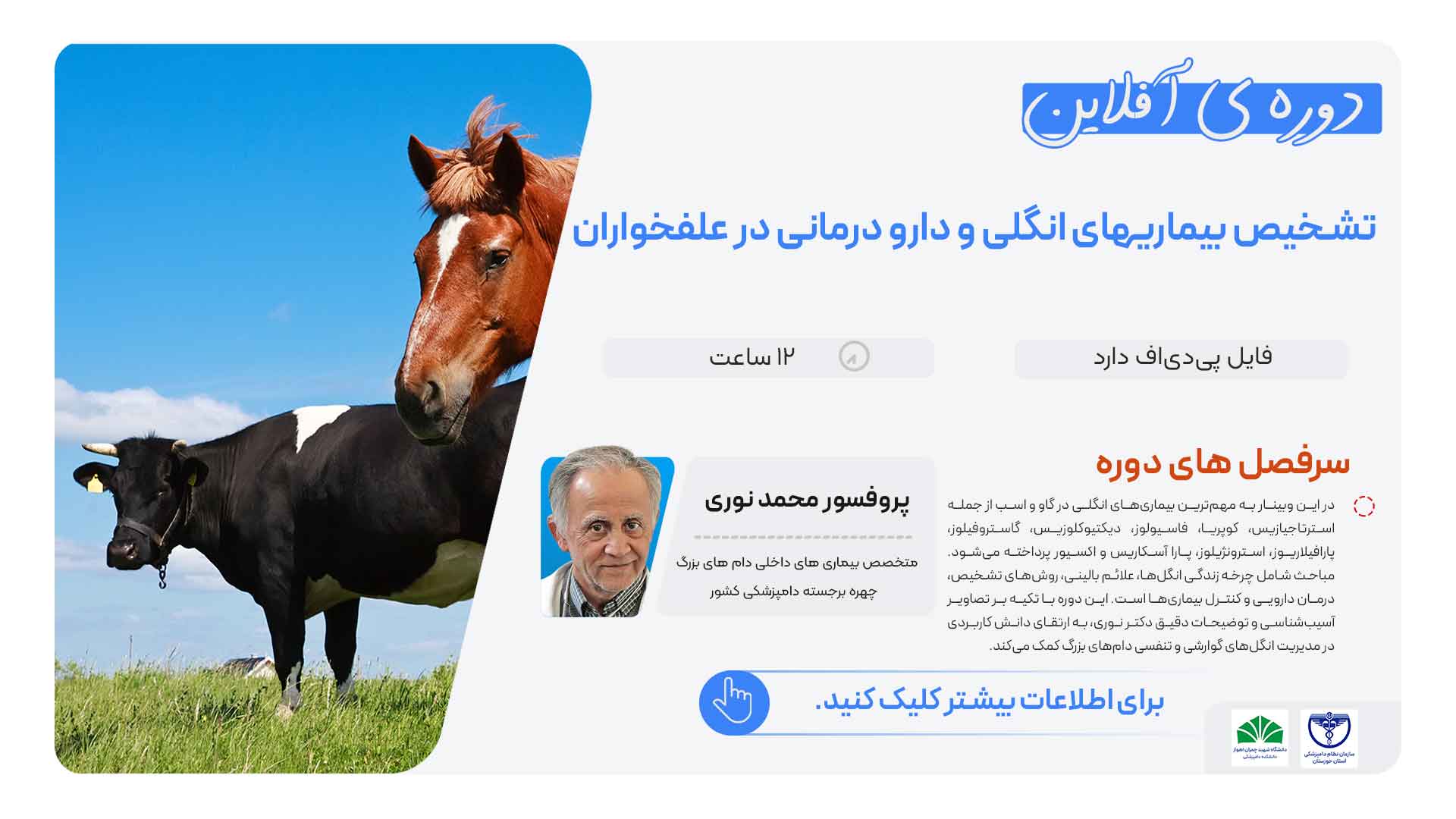 ما در شورای نظام دامپزشکی استان اردبیل از همکاری با شرکت آموزشی بیستوری کاملاً رضایت داریم. دورههای آموزشی این مجموعه با وجود غیرحضوری بودن، کیفیت آموزش بالایی داشت و محتوای دورهها مفید و کاربردی بود. مدرسین با حوصله، منظم و مسلط بودند و پشتیبانی مجموعه هم بسیار خوب بود و نارضایتی از این بابت از جانب شرکت کنندگان عنوان نشده است . از زحمات تیم بیستوری صمیمانه سپاسگزاریم.